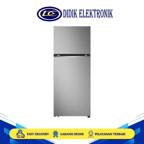 Kulkas dua pintu LG 202 L (gross) / 187 L (net), dengan Smart Inverter Compressor, sistem pendinginan Multi Air Flow, dan teknologi Total No Frost. Dilengkapi Big Veggie Box, rak tempered glass, serta panel kontrol knob manual — desain elegan dengan finishing Dark Graphite Steel.